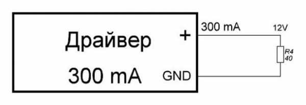 Например, подключим к источнику напряжением 12 В резистор 40 Ом. Через него пойдет ток величиной 300мА.