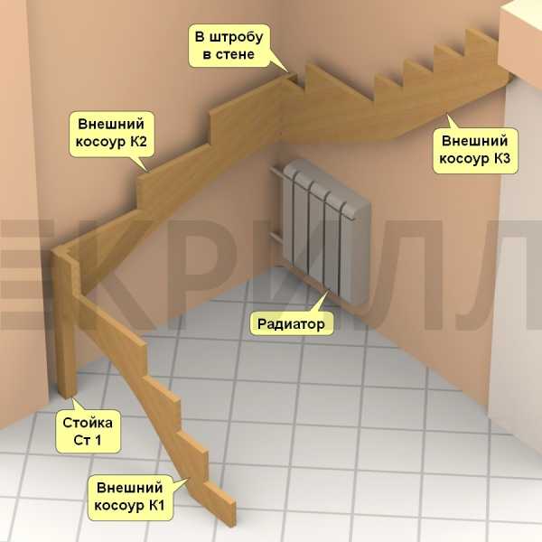 - Косоуры для поворотных ступеней. В данном случае требуется косоур только на одну сторону, второй стороной ступени будут крепиться к опорной балясине.