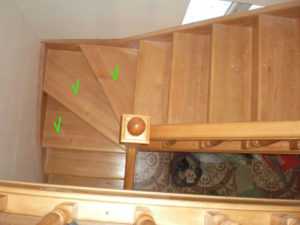 Лестница с тремя забежными ступенями (отмечены зеленым)Деревянная лестница с забежными ступенями своими руками