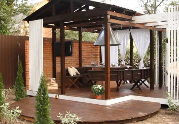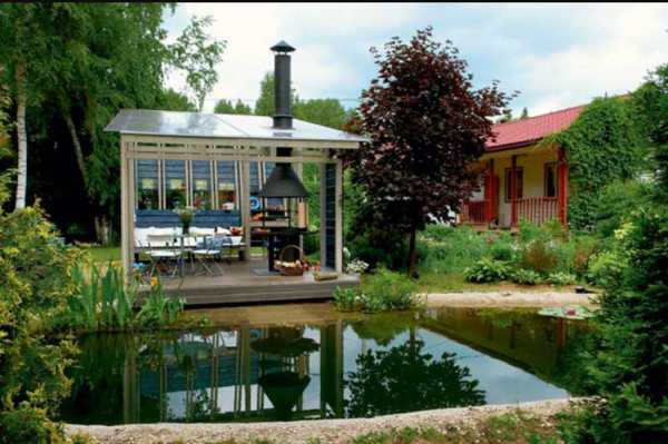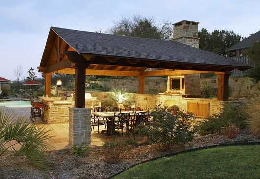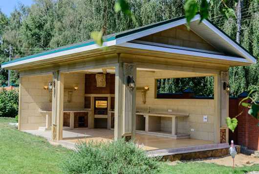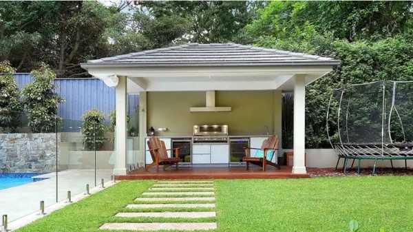– если размеры позволяют, то можно соорудить большой павильон, куда спокойно уместится пара десятков человек. Саму кухню необходимо располагать как можно ближе к дому, так как во время приготовления пищи вам потребуется электропитание, газ, вода и система слива. Все эти коммуникации намного проще установить рядом с основным жилым помещением. Самой готовкой можно заниматься на обычной кирпичной печи, специально сложенном очаге с вертелом, простой газовой или электрической плите с духовкой.