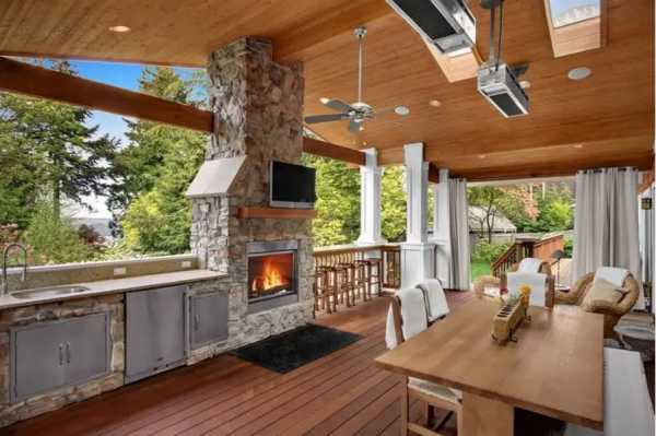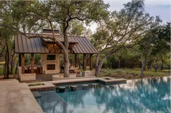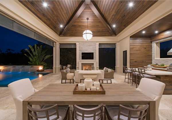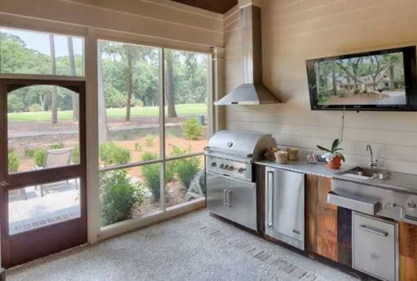 Идеальной планировкой, пожалуй, послужит летняя кухня барбекю, организованная под навесом. Так, будет предусмотрена необходимая защита от внезапно начинающегося дождя без потери доступа к открытому пространству. Инфракрасный обогреватель при этом послужит идеальным средством против неожиданного похолодания.