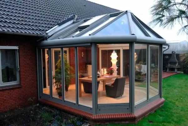 Застекленная летняя кухня с мангалом.