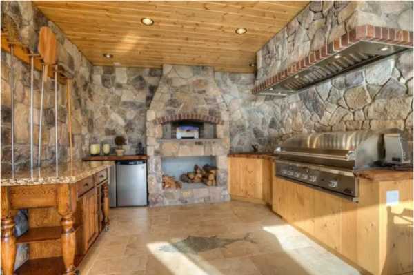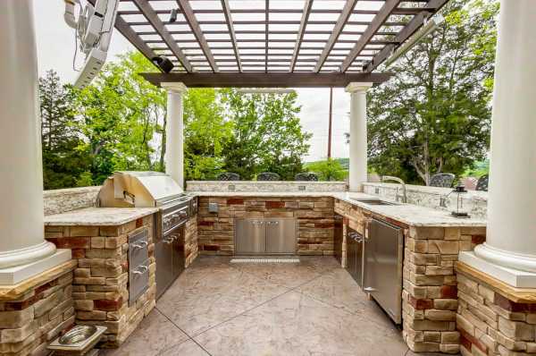 На фото изображена летняя кухня открытого типа с барбекю