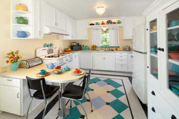 На фото светлый напольный линолеум с цветочными узорами в интерьере кухни.