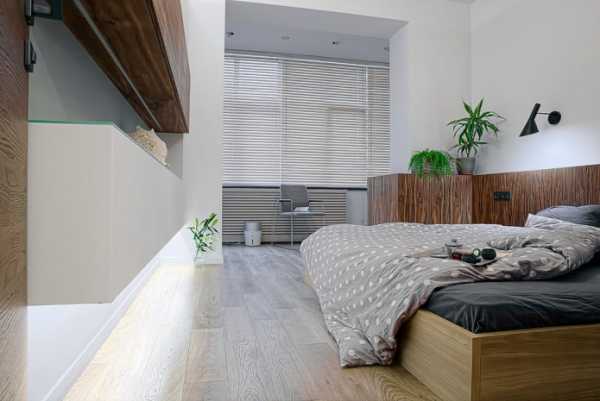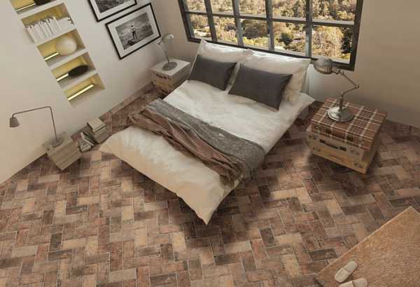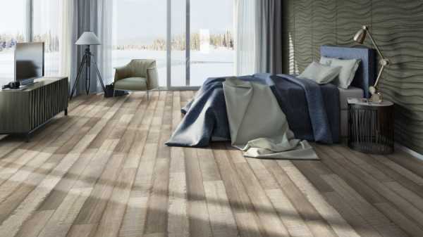 На фото пол в спальне, облицованный линолеумом, имитирующим паркетную доску.
