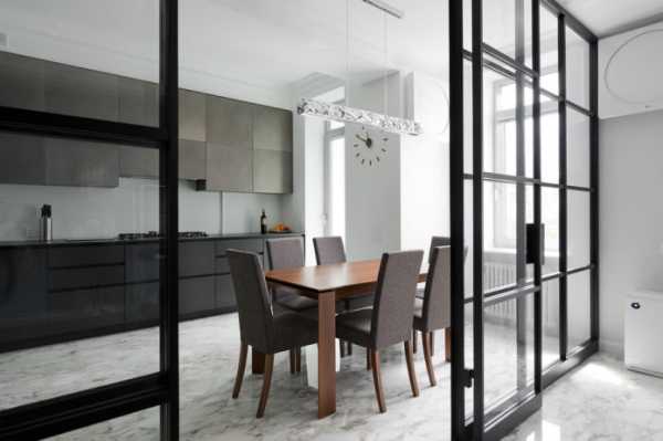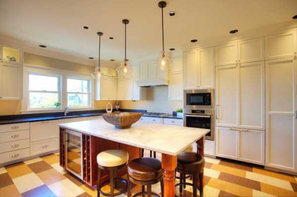 На фото интерьер кухни с линолеумом с имитацией под мрамор белого оттенка.