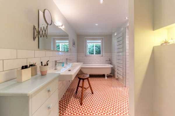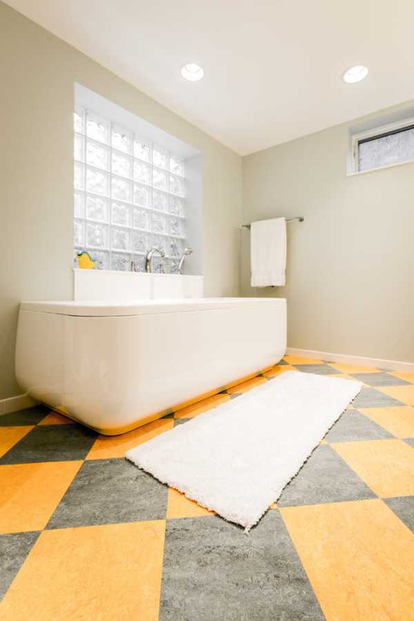 На фото линолеум с мелким геометрическим принтом в интерьере просторной ванной комнаты.