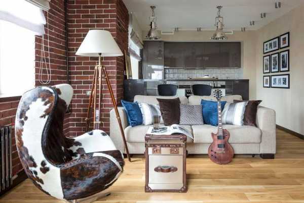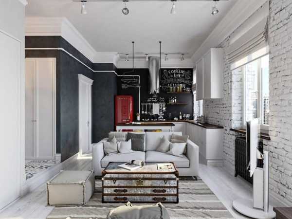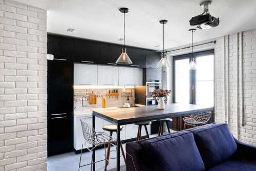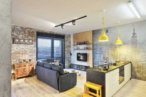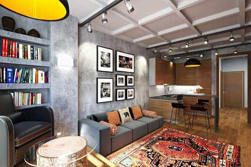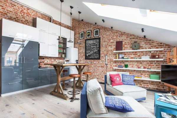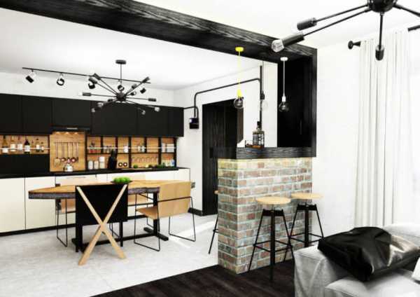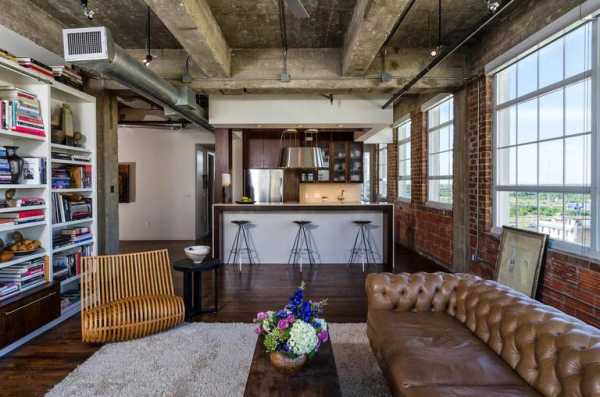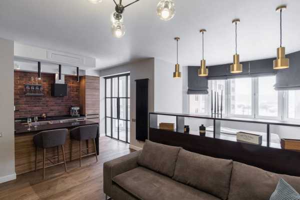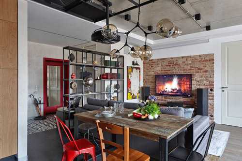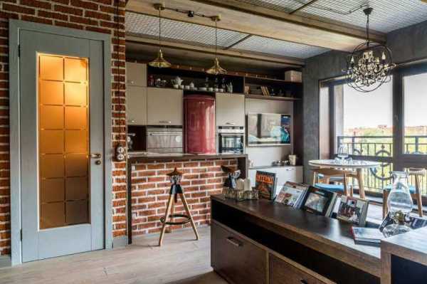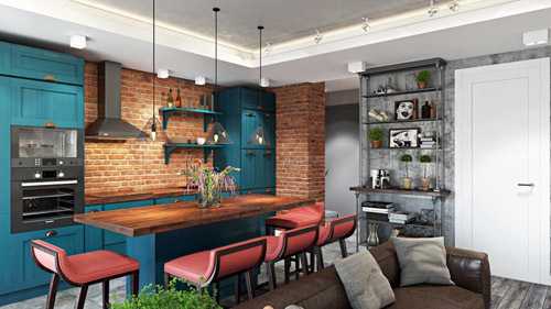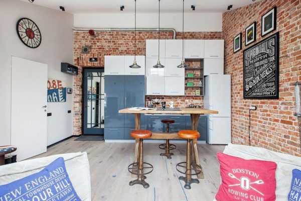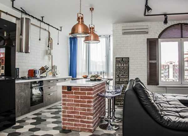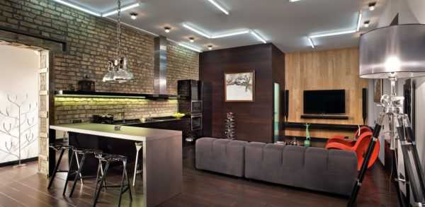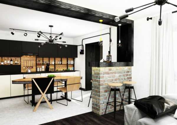 Оригинальный дизайн кухни-гостиной в стиле лофт