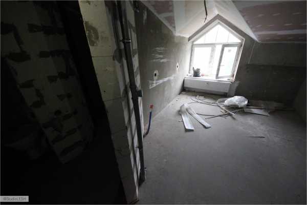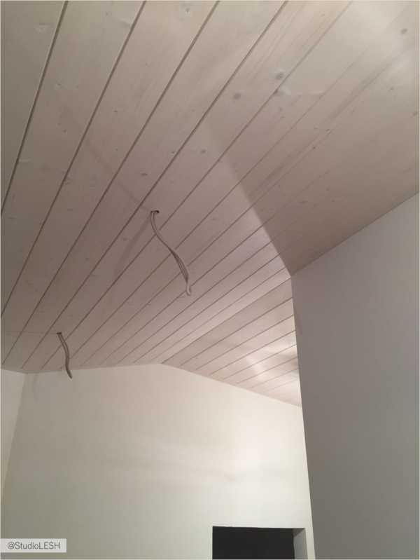 После окончания демонтажных и черновых работ мы приступили к работе с потолком. Первоначальная сложность проекта заключалась именно в нем, поскольку квартира располагается на последнем этаже малоквартирного дома и имеет сложный мансардный потолок. По задумке дизайнера по всей площади потолка была установлена белая интерьерная доска. Сложности начались с самого начала.