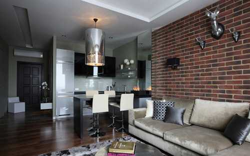 На стенах гостиной будет неплохо смотреться белая каменная кладка или светлая штукатурка. Как вариант, подойдет и белый декоративный кирпич. Коричневый кухонный гарнитур будет эффектнее выглядеть на белом фоне, а шкафчики светлых оттенков – на кирпичном или черном.