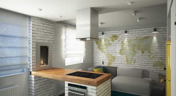 - различную отделку стен, чередуя в разных пропорциях кирпич, бетон (или покраску под бетон), штукатурку; для отделки кухонного фартука подойдет плитка или водостойкие обои «под кирпич»;