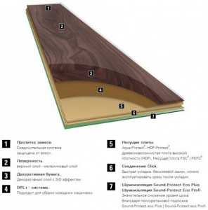 Влагостойкий ламинат по своей структуре схож со своими предшественниками. Он так же изготавливается на основе волокнистых плит, имеющих высокую плотность. Кроме основы, панели такого покрытия также оснащаются декоративной накладкой с защитной пленкой и шумоизоляционным нижним слоем.