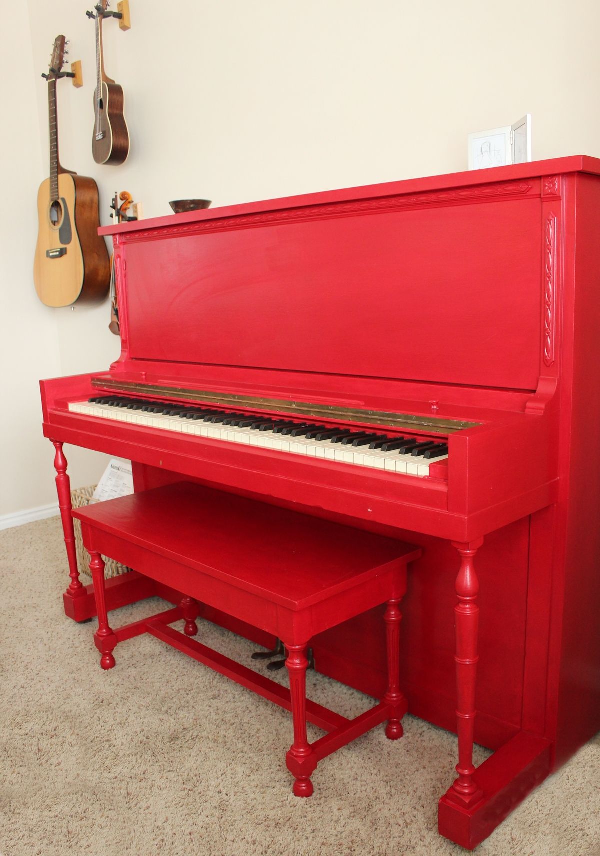 В этой милой гостиной размером с почтовую марку прямо у парадного входа в дом нет недостатка в естественном освещении, что делает пианино ярким красным идеальное прикосновение энергии и сдержанного цвета. Пианино грунтовали и красили в три-четыре слоя.