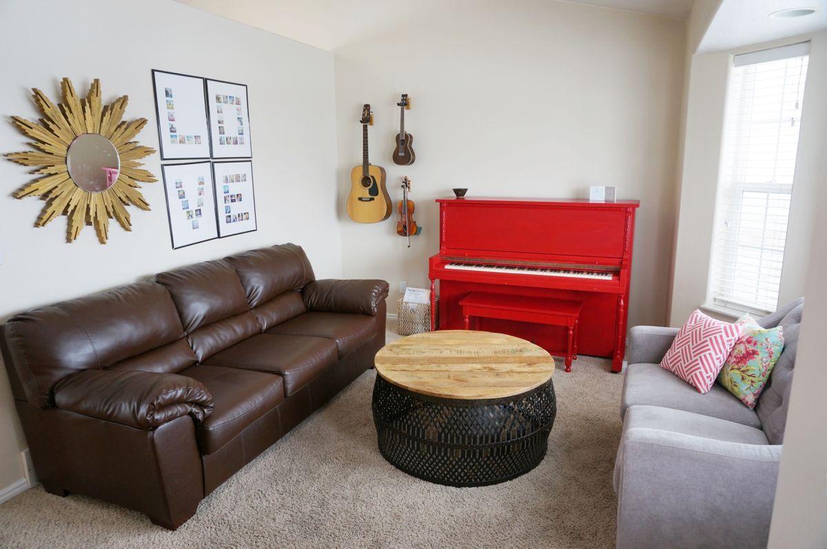 С таким смелым заявлением, неплохо сохранить пространство, заземленное другими нейтральными предметами.Круглый журнальный столик с тканой текстурой сохраняет визуальный интерес, не конкурируя с окрашенным в красный цвет пианино.