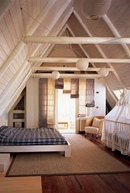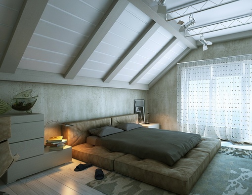 Мансарда предполагает минимализм вещей. Не стоит забивать помещение большим количеством предметов. Да и косой потолок не даст такой возможности.