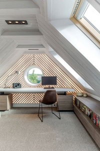 Для многих людей работа на дому является нормой, поэтому офис будет весьма кстати. Мансарда идеально подходит для домашних офисов, потому что она находятся вдали от общего пространства жилища, исключая шум и гам. Чердачный домашний офис может быть красиво оформлен со встроенным столом и шкафами, включая небольшую зону развлечений в виде дивана и телевизора.