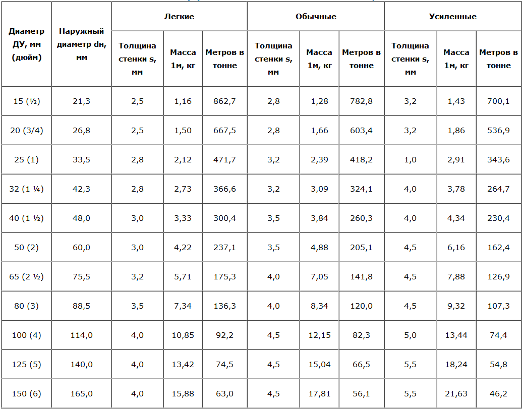Такие показатели, как вес 1 метра трубы или количество метров в 1 тонне, справочно показаны в таблицах государственных стандартах.