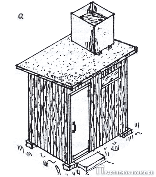Бывает несколько видов туалетов в виде скворечника, шалаш, избушка или домика.