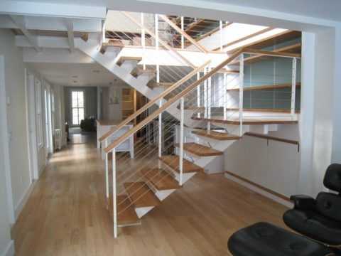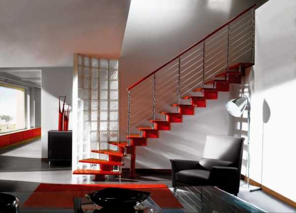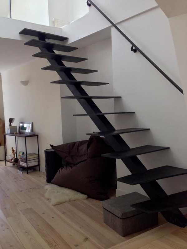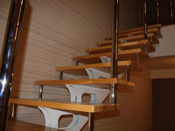 Наверное, самый необычный каркас лестницы. Принцип заключается в том, что крепление ступеней осуществляется с одной стороны, в результате чего создается ощущение легкости лестницы.