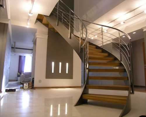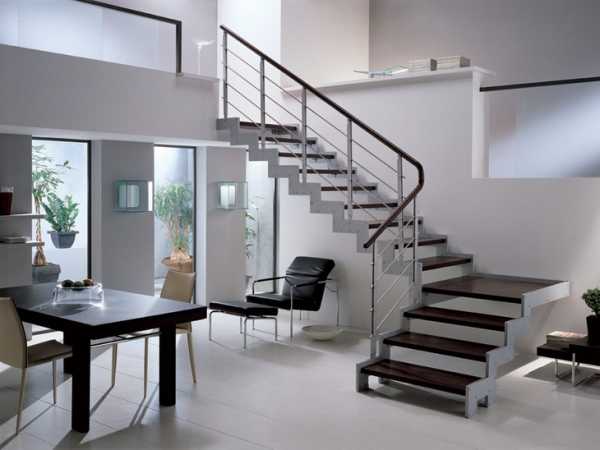 Металлическая, благодаря свойствам металла, конструкция крепче и долговечнее деревянного. Существуют множество вариантов лестниц с металлическим основанием, но самым популярный являются лестницы с деревянными ступеньками из дуба или бука. В общественных помещениях и в домах с большой численностью людей, устанавливают ступени из камня, так как это самый прочный, но дорогой материал.