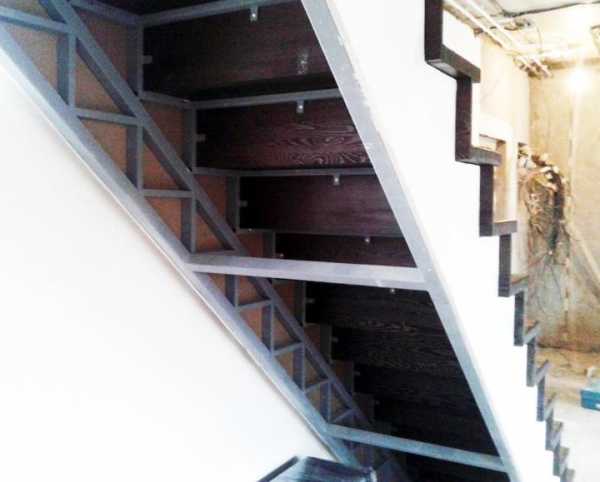 Закрытая – находится за ступенями и панелями, благодаря чему не видно сварочных швов, поэтому можно использовать более дешёвые металлические элементы. Стойками является швеллер, который также выполняет функцию крепежа, соединяющего стойки.