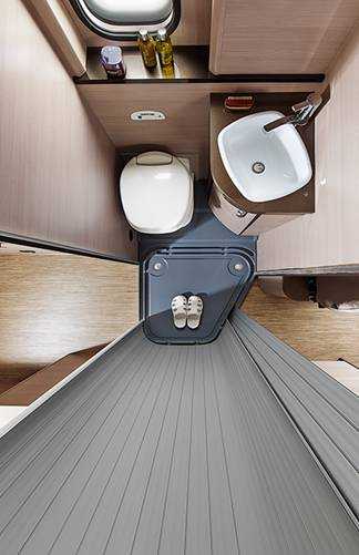 Если дом на колесах имеет туалет и душ, этот отсек отгорожен. В обычном состоянии доступны туалет и умывальник, шкафчик для всякой мелочи. Для принятия душа надо «вынуть» створки душевой кабины. При этом они прикроют дверь, умывальник утопиться в стену, места станет чуть больше, но все равно не слишком просторно. Так как запас воды очень ограничен, душем, как правило, пользуются редко.