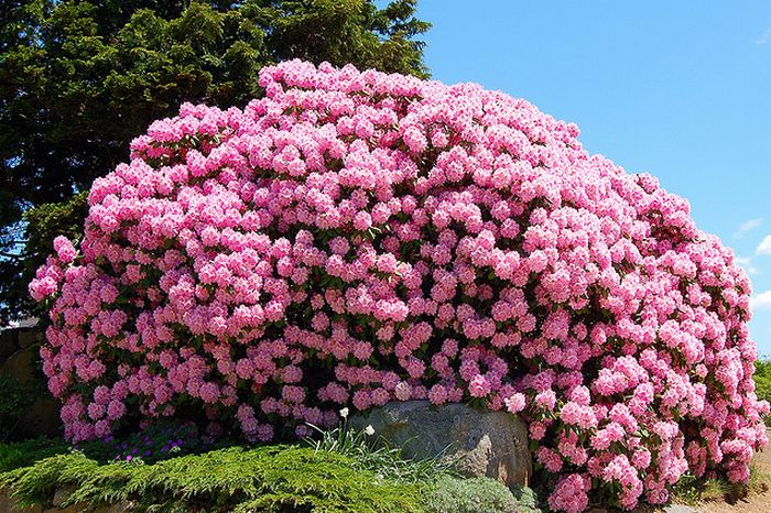 - Рододендроны — великолепно цветущие красивые кустарники, которые к тому же предпочитают быть укрытыми от полуденного солнца. Традиционно представителей рода подразделяют на рододендроны и азалии. Рододендроны, растущие в тени в среднем достигают в высоту 1,5 метра, цветут в мае, однако есть растения как 30 см, так и 6 м, цветущие как ранней весной, так и осенью, в августе. Окраска цветов разноообразна, за исключением голубой, листья овальные или продолговатые, зимующие. Для всех рододендронов характерно неглубокое залегание корней, поэтому почву под растениями мульчируют, в сухую погоду обильно поливают.