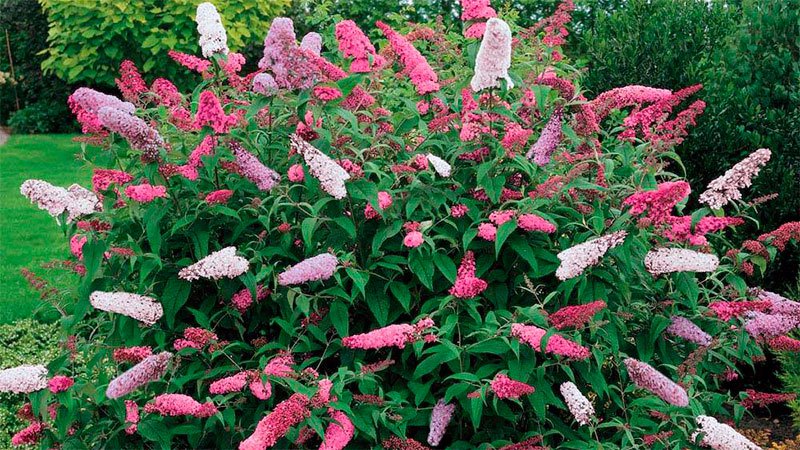 - Будлея. Она напоминает сирень, может вырасти до трех метров. Оттенки цветов: розовый и лавандовый, пурпурный и белый, а также белый. Эти красивые кустарники будут украшать сад все лето, потому что цветут до заморозков.