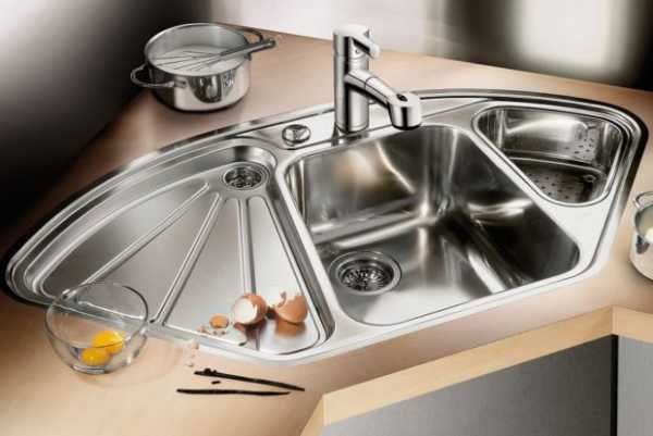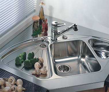 Отличный вариант – угловая мойка. Она позволяет эффективно использовать кухонное пространство, ведь все мы знаем, что углы порой бывает обустроить непросто. Часто угловые мойки дополняются крыльями по обе стороны для сушки посуды. Нередко также подобные изделия получают дополнительную чашу.