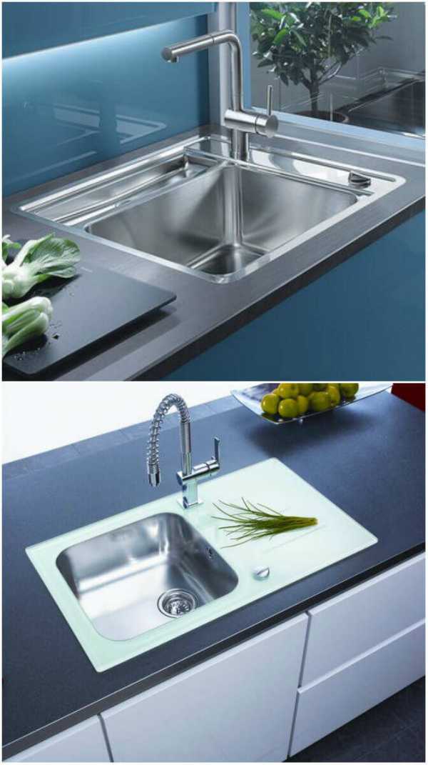 Если в бюджете вы не ограничены, можно обратить внимание на мойки, в которых чаша выполнена из нержавейки, а рабочая поверхность – из закаленного стекла. Выглядят такие изделия современно, в эксплуатации они безопасны (толщина стекла 8 мм), но по цене догоняют, а иногда и перегоняют изделия из искусственного камня.