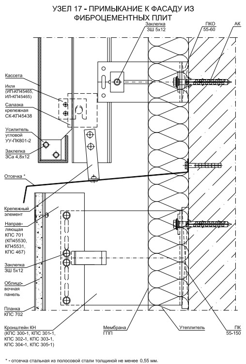 Крепление облицовочных плит осуществляется с помощью заклепок или самонарезающих винтов из коррозионностойкой стали. При креплении плиты расстояние от саморезов (заклепок) до нижней и верхней кромок плиты: для плит длиной до 1 м – 50 мм, от 1 м до 1,5 м – 100 мм, свыше 1,5 м — 150 мм. Расстояние от саморезов (заклепок) до боковых кромок плиты – min 30 мм, шаг между саморезами (заклепками) по краю плиты – не более 400 мм; допускается крепить середину листа с шагом max 600 мм.