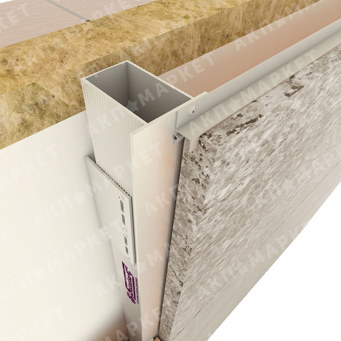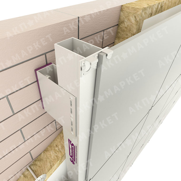 Вертикальный каркас состоит из основных профилей «П» — образной формы и промежуточных «2»-образных профилей. Основной профиль устанавливается в местах стыковки фасадных плит; промежуточный — в средней части фасадных плит, а также в конструкциях наружного и внутреннего углов, откосов окон. Шаг вертикальных профилей составляет 600 мм. Для компенсации температурных деформаций в вертикальных направляющих необходимо оставлять зазор через каждые 4-5 м. Температурный разрыв профилей устраивается в местах горизонтального стыка фасадных плит. Вертикальные профиля крепятся к горизонтальному профилю самонарезающими винтами 4,8×20 мм.