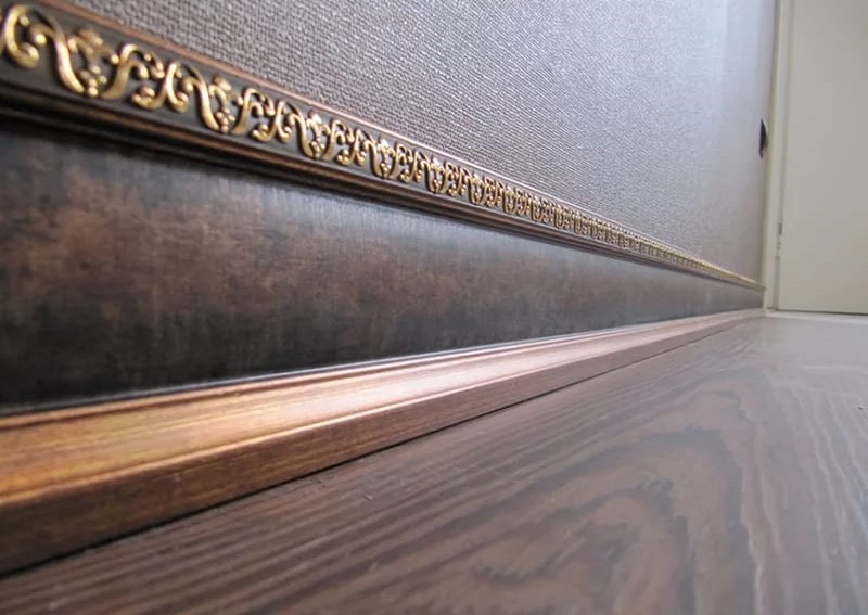 Для этого можно применить акриловые или водоэмульсионные краски, а также красящие составы для художественной росписи. Glaise perfect – тонирующие составы, с помощью которых можно придать плинтусам любую фактуру эффекта дерева, потертости, камня, золота.