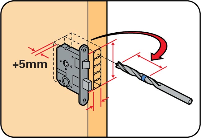 - Первым делом необходимо наметить контур замка на внешней и внутренней поверхностях замка. Для этого можно приложить механизм к двери и обвести его. Лучше всего сделать это с помощью бумажной копии. На бумажном шаблоне легче отметить расположение замочной скважины и места отверстий под болты.