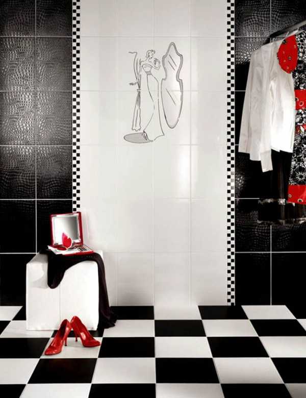 Можно использовать и контрастные цвета. Отлично будет смотреться черная плитка с белым ламинатом. Данный вариант идеально подойдет для стиля хай-тек.