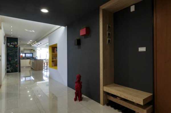 Клинкерная плитка и яркие стены в коридоре.