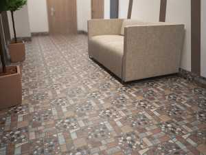 Дизайн напольной плитки для оформления коридора.Плитка характеризуется большим запасом прочности от механического воздействия: выдерживает удар от падения тяжелых предметов.