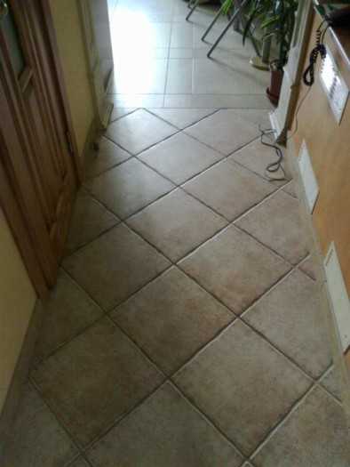 В коридоре диагональная раскладка, на кухне стандартная раскладка и другая плитка. Место стыка смотрится некрасиво.