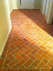 Клинкерная напольная плитка для коридора под кирпич. Раскладка ёлочкой с бортиком по периметру.