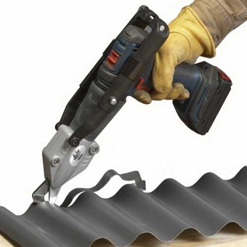 Специальными насадками на дрели можно выполнять как прямолинейные, так и криволинейные резы. Делать фигурные резы для установки желобов водосточной системы или вентиляционных деталей кровли, резать в вертикальном и горизонтальном направлении.После применения инструмента срез получается аккуратным. Насадка не требует регулировки и проста в обслуживании.