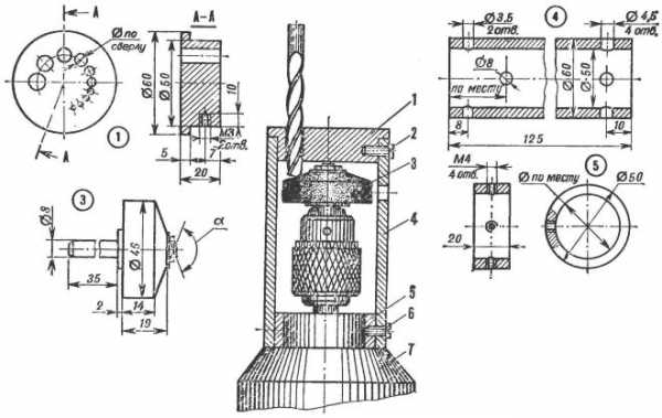 Приспособление для дрели, используемое при заточке инструмента, можно изготовить и самостоятельно, что успешно и делают многие домашние мастера. Конструкция самодельных насадок для заточки сверл мало чем отличается от устройства серийных моделей и, как правило, включает в себя следующие элементы: