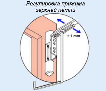 Настраивать петельный прижим можно обеим петлям сразу или только одной петле. Корректировать верхнюю петлю можно только откидывающимся створкам