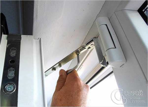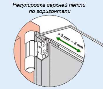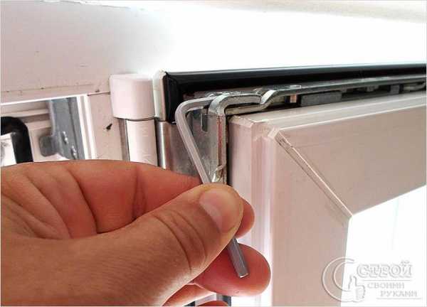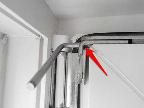 Для регулировки верхней петли надо открыть окно в режиме проветривания и вставить ключ-шестигранник в отверстие. Вращая его влево — вправо (у каждого производителя — в свою сторону), можно изменять прижим петли.