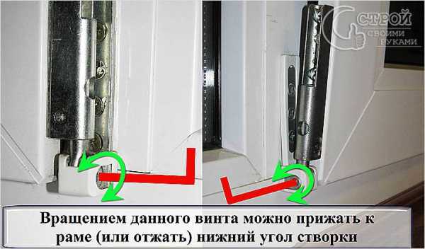 Производимая регулировка зависит от появившихся проблем. Если окно пропускает сквозняк и звуки, то следует отрегулировать степень прижима створок к раме. Для этого по периметру окна расположены специальные цапфы, меняя их положение, можно усиливать (опуская цапфу) или ослаблять (поднимая цапфу и поворачивая ее против стрелки) прижим створок. Советуют устанавливать верхнее положение на летний период, а нижнее более плотное закрытие, для зимнего времени.