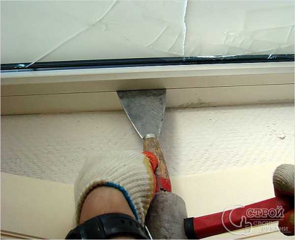 Необходимо с помощью нижней петли максимально опустить створку. При закрытом окне шпателем вынимаются штапики (не забудьте пометить расположение) и сам стеклопакет.