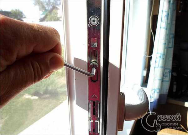 Чтобы правильно отрегулировать окно, необходимо использовать верхнюю и нижнюю петли, которые имеют отверстие для шестигранного ключа. Вращая по часовой стрелке шестигранный ключ, створку притягивают к петле. Находящийся напротив петли низ окна должен при этом немного подняться