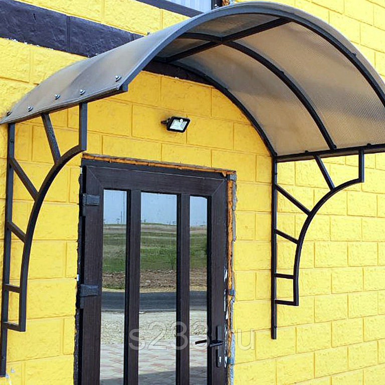Арочный козырек из поликарбоната над крыльцом хорош тем, что вода во время дождя или таяния снега стекает не на ступени, как в случае с прямым односкатным вариантом, а по бокам. Вход или выход из дома будет максимально комфортным – вы не намокните, а перед ступенями не будут собираться лужи. С другой стороны арочная конструкция требует наличия изогнутых элементов. Самостоятельно согнуть профильную трубу или уголок без специального оборудования не получится. Посмотрите в интернете фото, козырьки из поликарбоната над крыльцом арочной формы выглядят привлекательно, но можете ли вы сделать нечто подобное своими руками?