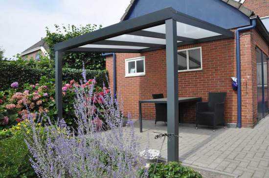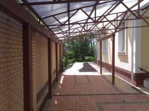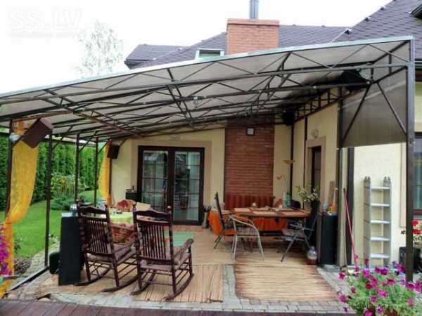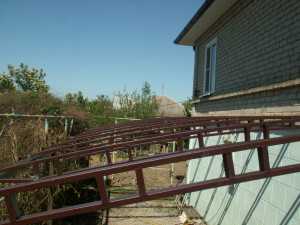 Подобная конструкция отличается от деревянной только тем, что крыша опирается только на опорные стойки, при этом не имеет при этом точек соприкосновения со стеной дачного дома. Четыре несущие опоры устанавливаются вертикально. Для стоек используют профилированные трубы (сечение 60 на 40 мм).