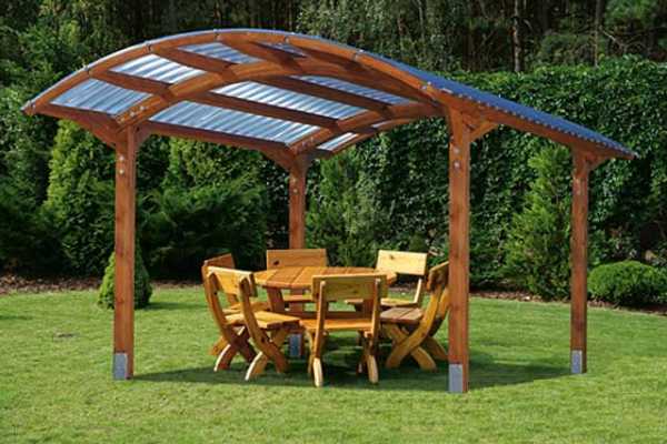 - Сложной формы. Самой популярной в ряду является арочная конструкция, имеющая гнутую крышу. По форме она напоминает полукруг. Характеристика «сложная» относительная, поскольку садовые навесы для дачи, имеющие такую форму, можно сделать самому. Главное, правильно подобрать кровельный материал, к примеру, для отделки отлично подойдут профилированные – они прекрасно гнутся.