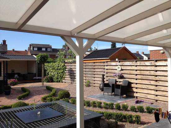 В плане дизайна с навесами особых проблем нет, решения могут быть самые разнообразные. Это может быть легкая крыша на террасой, небольшой козырек над крыльцом или отдельное сооружение в виде беседки. Материал для навеса выбирают тоже в зависимости от потребностей. Это может быть перекрытие в виде перголы для создания тени, листы поликарбоната, профнастила или летний вариант брезентового тента.